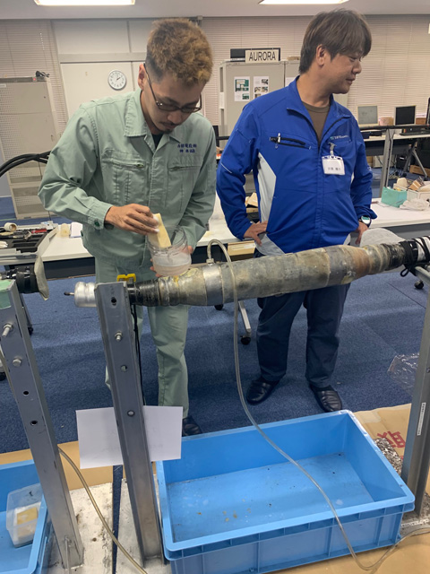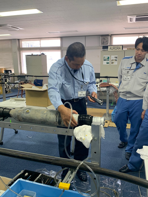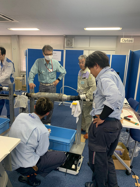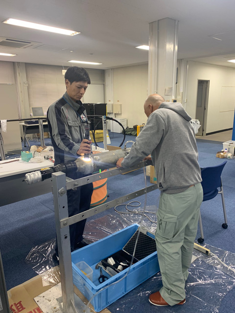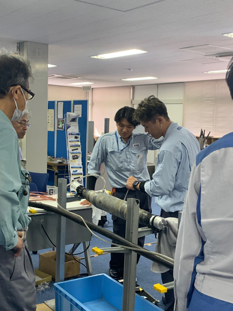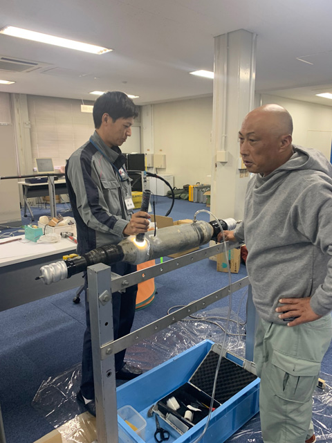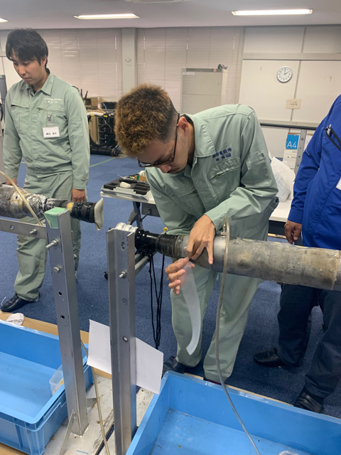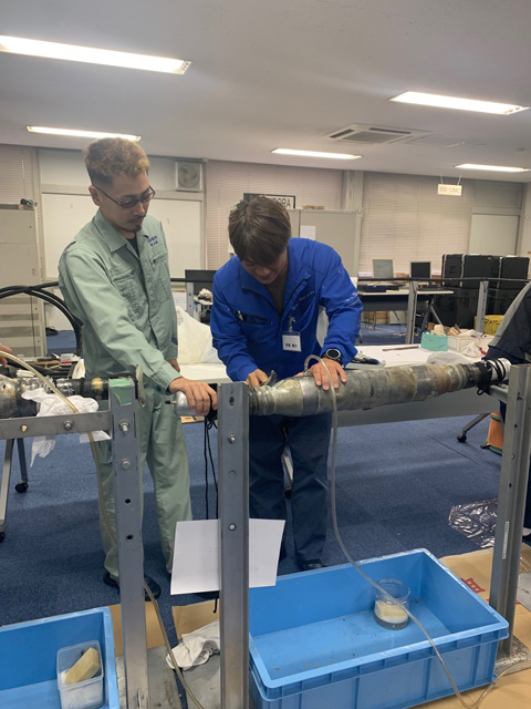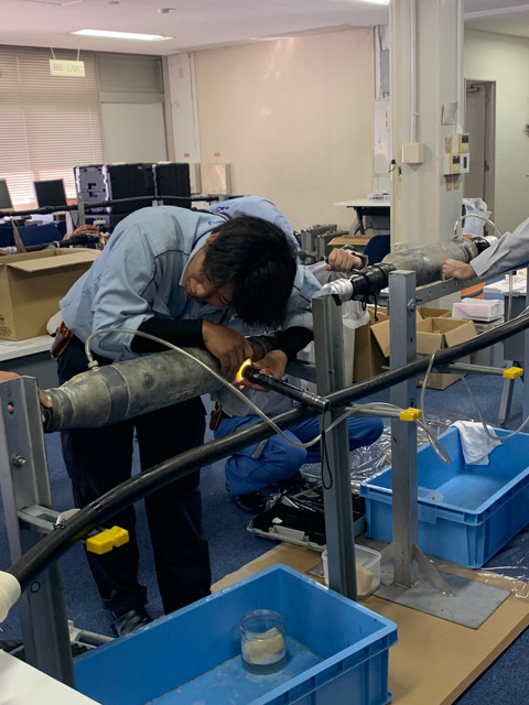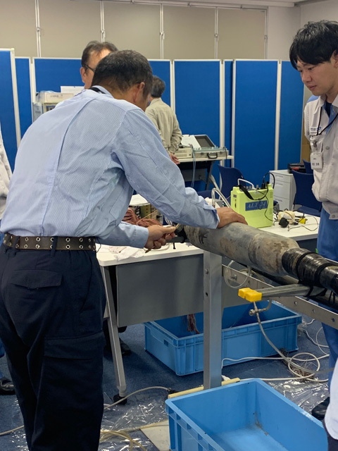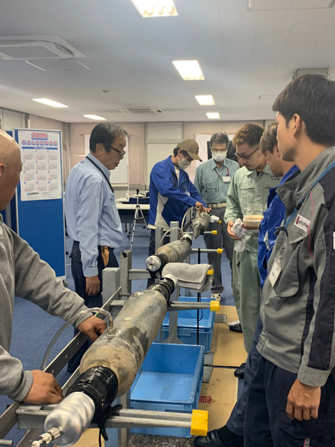 加圧した鉛管を用意し、修理する実習を行い、ケーブル外被や鉛管のガス漏れに対して、修理方法をご説明しました。ナノマテックスを使用した修理を実習して、高い有効性と利便性をご理解頂きました。